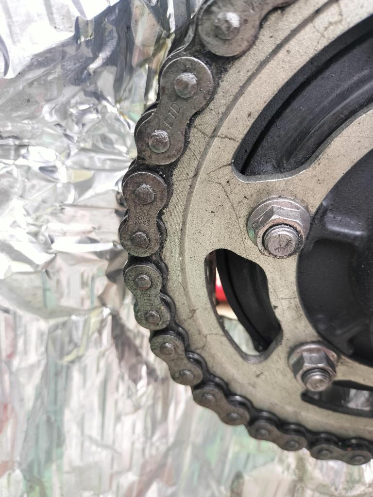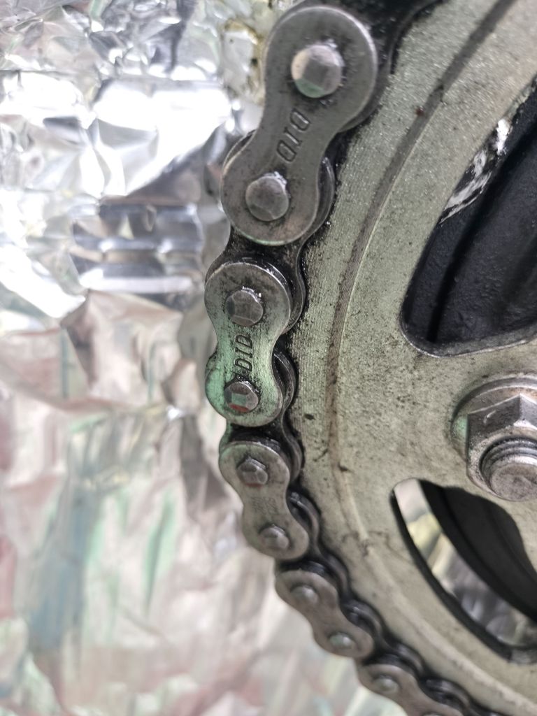 チェーンクリーナーを吹付け、軽くブラシをかけ、拭き取ったのですが、その工程を撮影し忘れました。画像は、チェーンルブを吹付け、15分後に余分なルブを拭き取った後のメンテナンス後です。