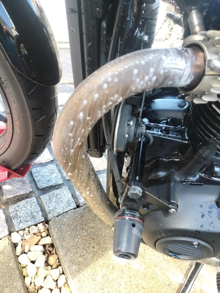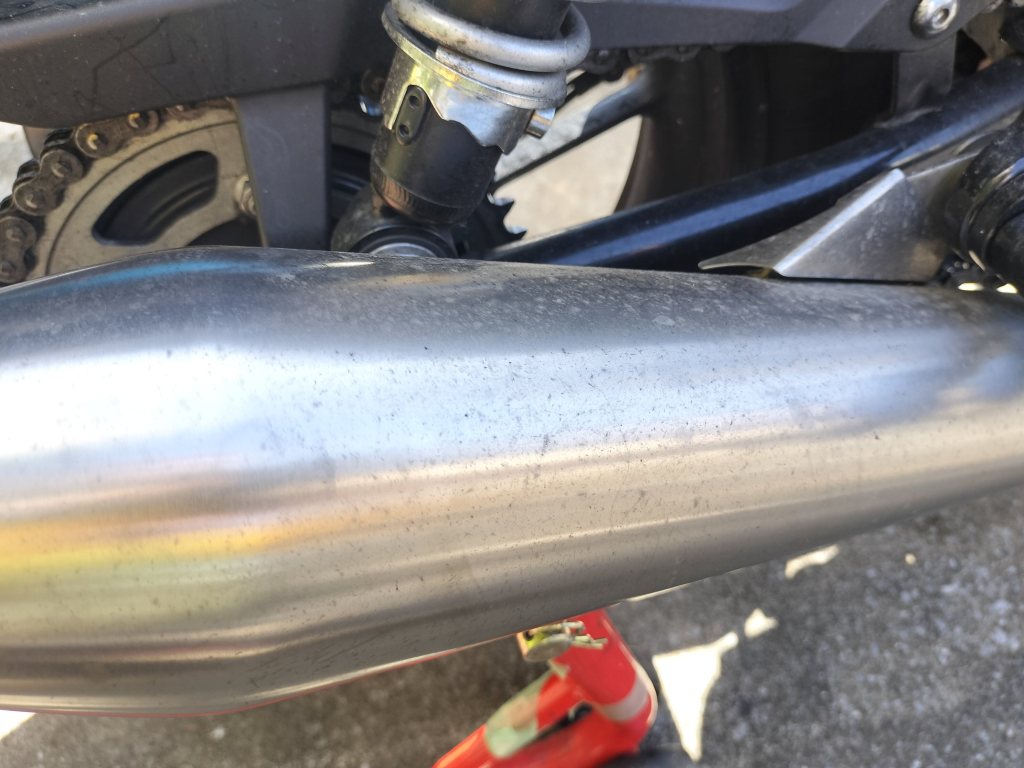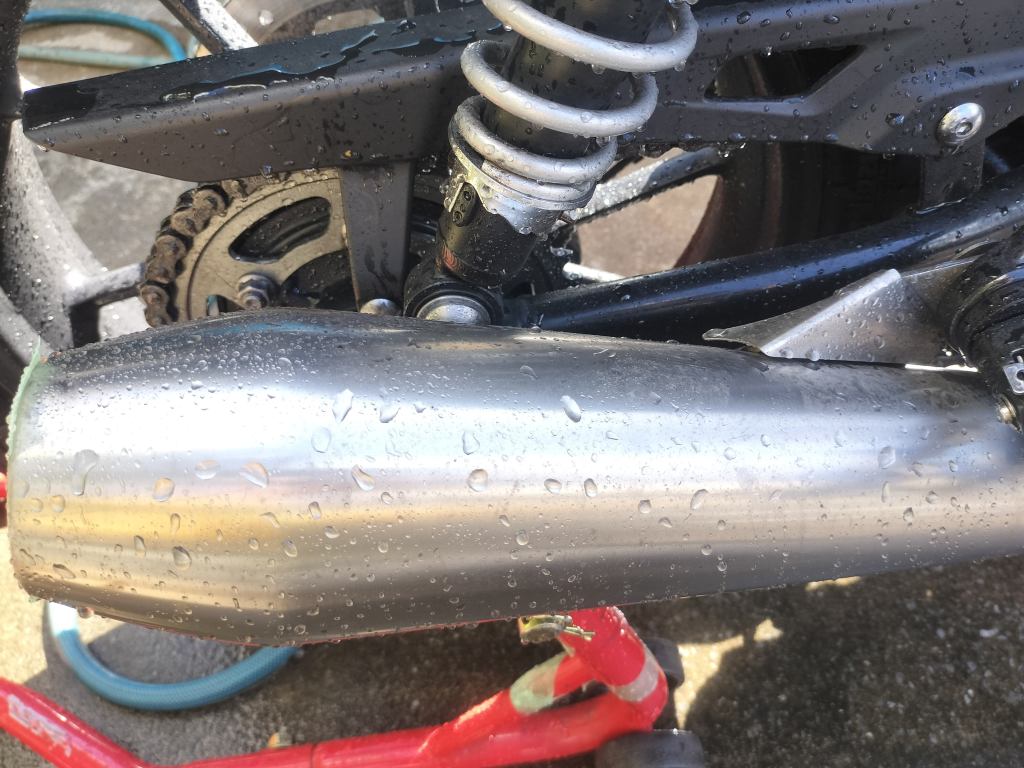 シャンプーで汚れを落とします。タンクなどはカエルくん、エキパイやマフラーはクリームクレンザー、リヤホイールやチェーン周辺はカークリームを使いました。気候も良かったので、一生懸命頑張りました。