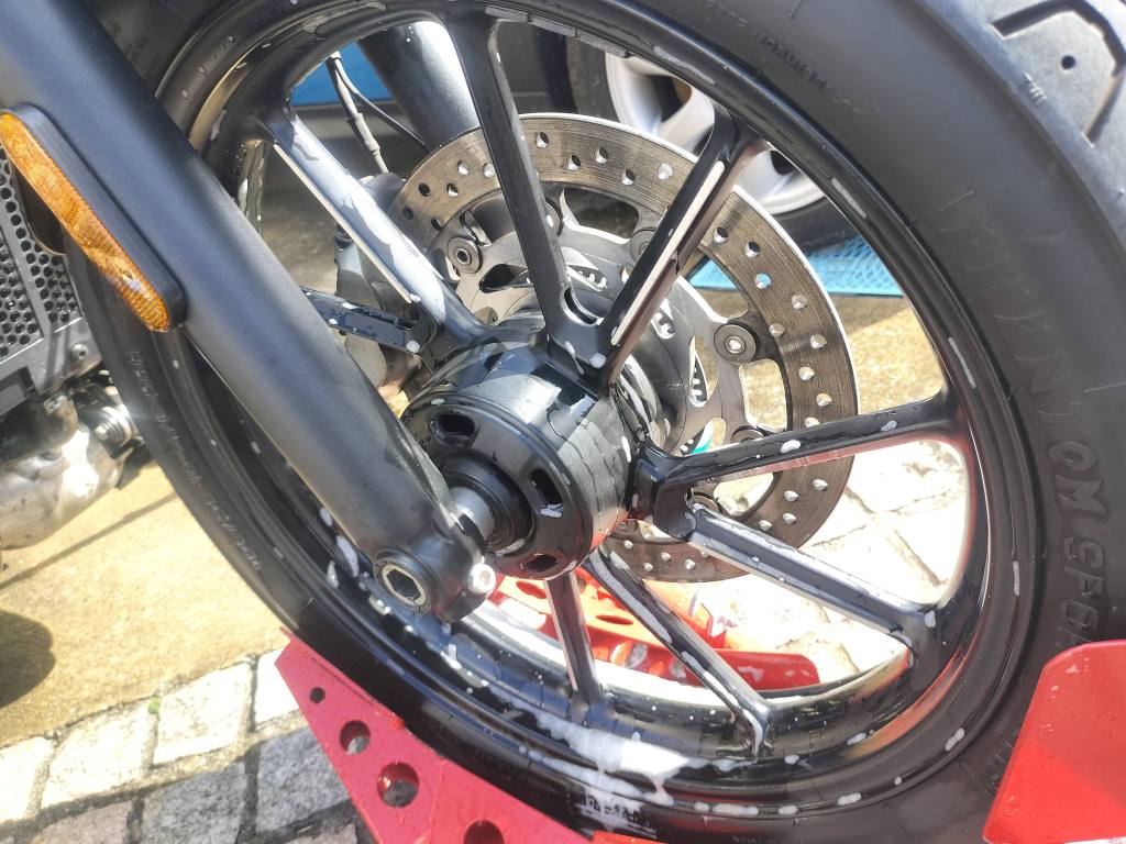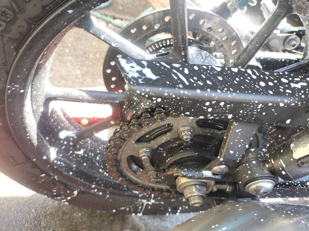 シャンプーを流水で落とし、水滴をタオルやエアブローで取り除いて出来上がりです。リヤホイール周辺はカークリームを使いましたが、チェーンルブによる汚れは頑固です。もう少し工夫しないとピカピカには届かない感じでした。少しずつ模索したいと思います。