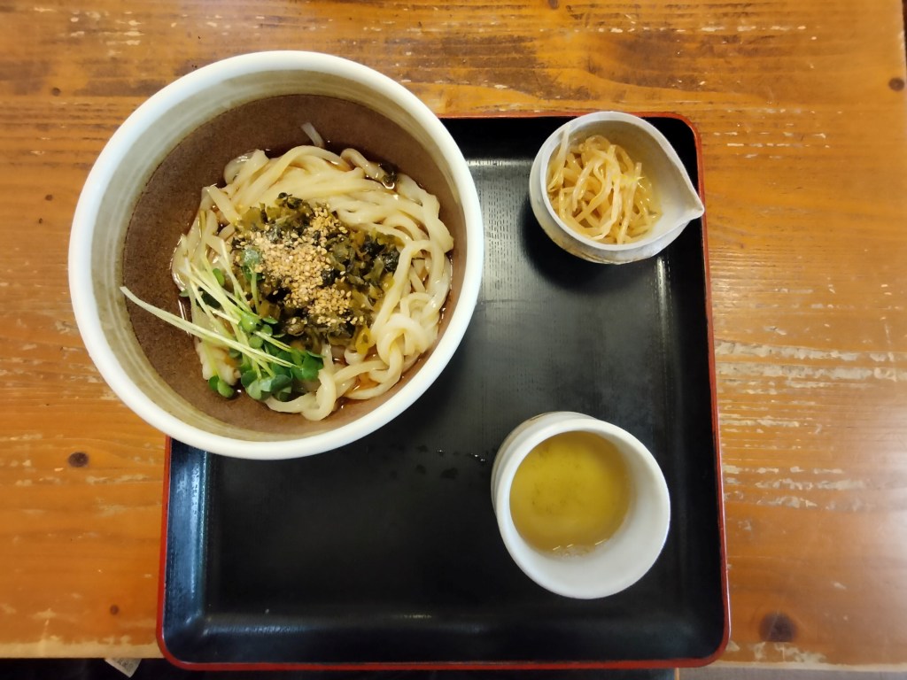 クチコミで高菜うどんが美味しそうだったので、高菜うどんを注文しました。うどんが茹で上がるまで、セルフサービスのおでんを頂きました。いろいろなおでん種があったのですが、大根とさつま揚げを頂きました。とても美味しかったです。しばらくして高菜うどんが運ばれてきました。やはりとても美味しかったです。うどんに腰があります。温かいおでんとうどんの組合せは美味しく、とても幸せでした。