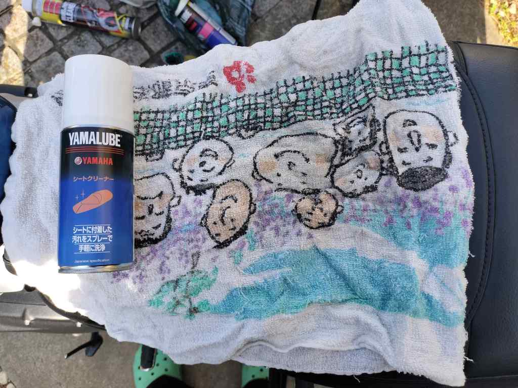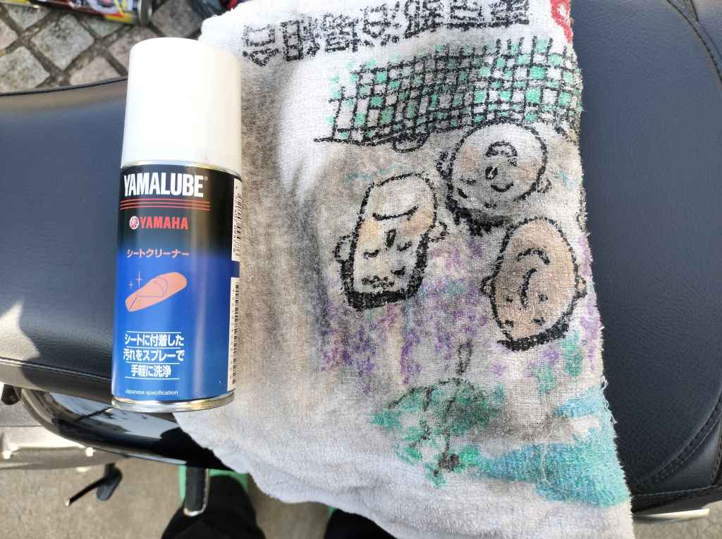 YAMALUBEのシートクリーナーを使用しました。左側の画像がクリーニング前です。クリーニングした後が右側です。タオルにクリーナーを吹きつけ、シートを拭き取りました。かなり汚れが落ちたようです。
