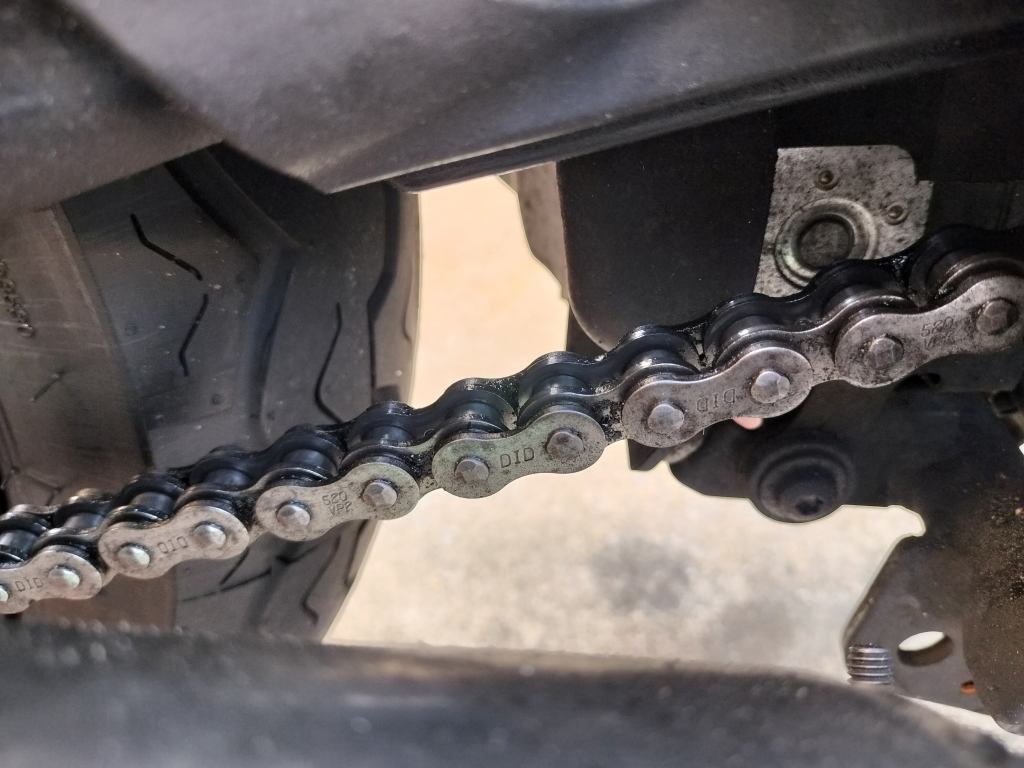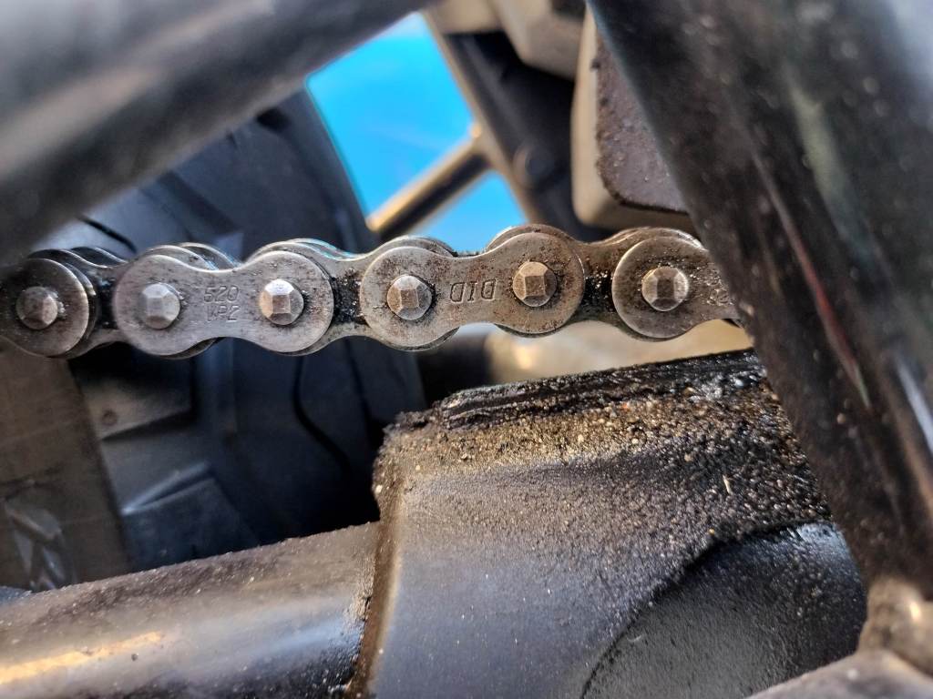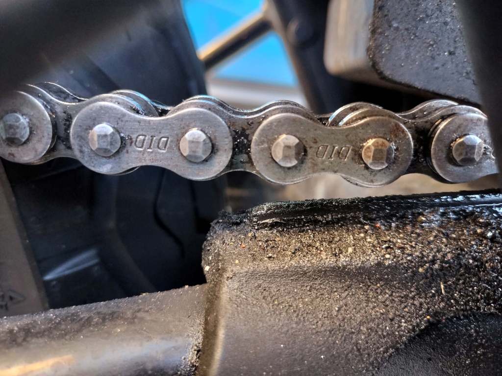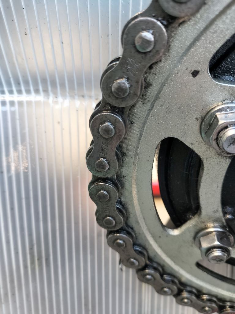 DIDのチェーンルブを吹付け、5分程度待ってからウエスで余分なルブを拭き取りました。ピカピカではありませんが、必要十分なメンテナンスはできたと思います。