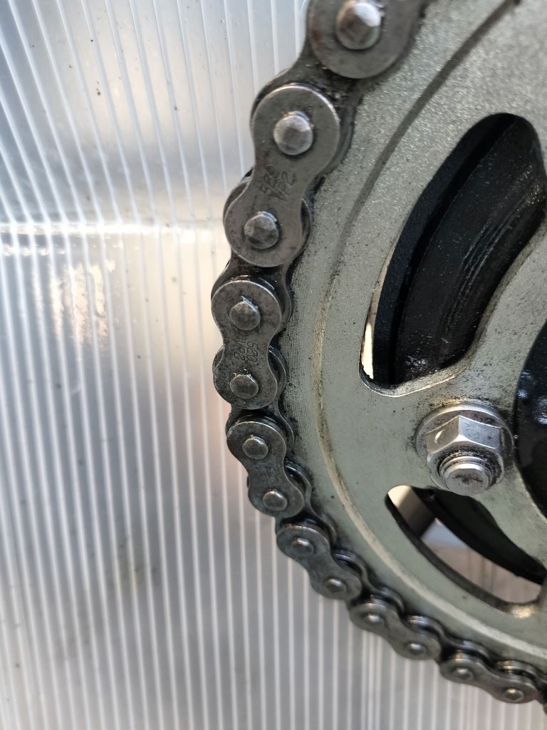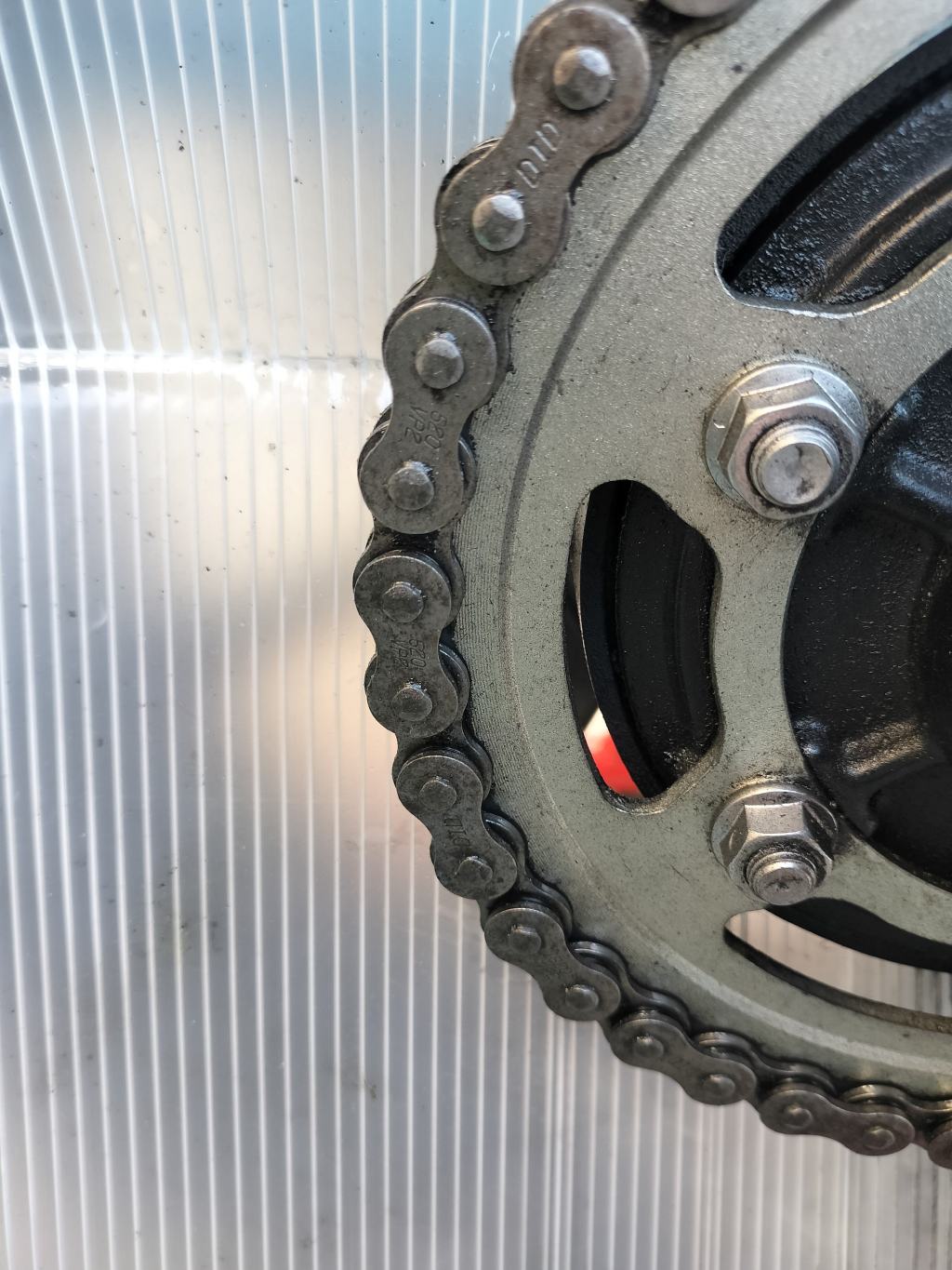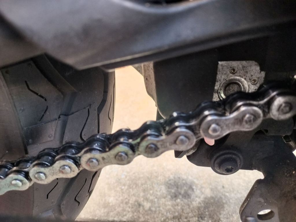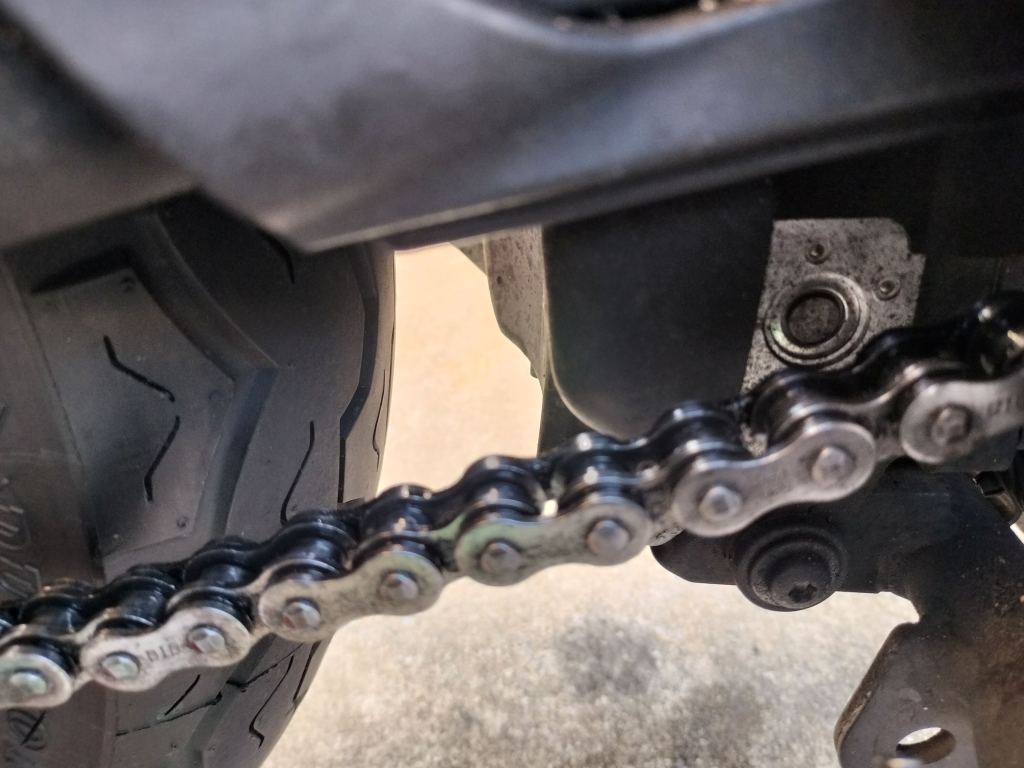 DIDのチェーンルブを吹付け、5分程度待ってからウエスで余分なルブを拭き取りました。ピカピカではありませんが、必要十分なメンテナンスはできたと思います。