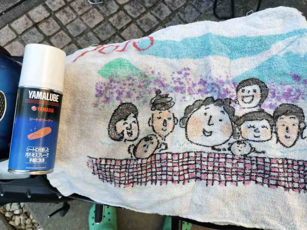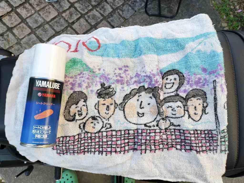 YAMALUBEのシートクリーナーをタオルに吹き付け、シートの汚れを拭き取ります。それなりに汚れを取り除くことができているようです。
