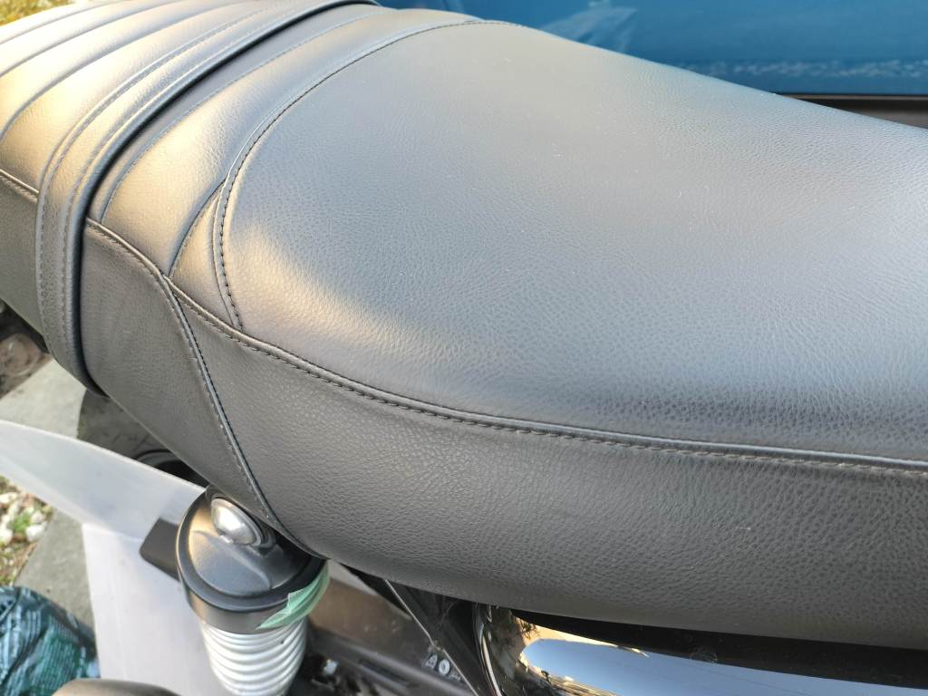 長野県へのツーリングでは帰りに雨に降られ、その後のツーリングでも雨に降られたりしたので、Street Twinのシートを清掃しました。シートを見ると、鳥の糞が付いた後を擦ったようなところもありました。