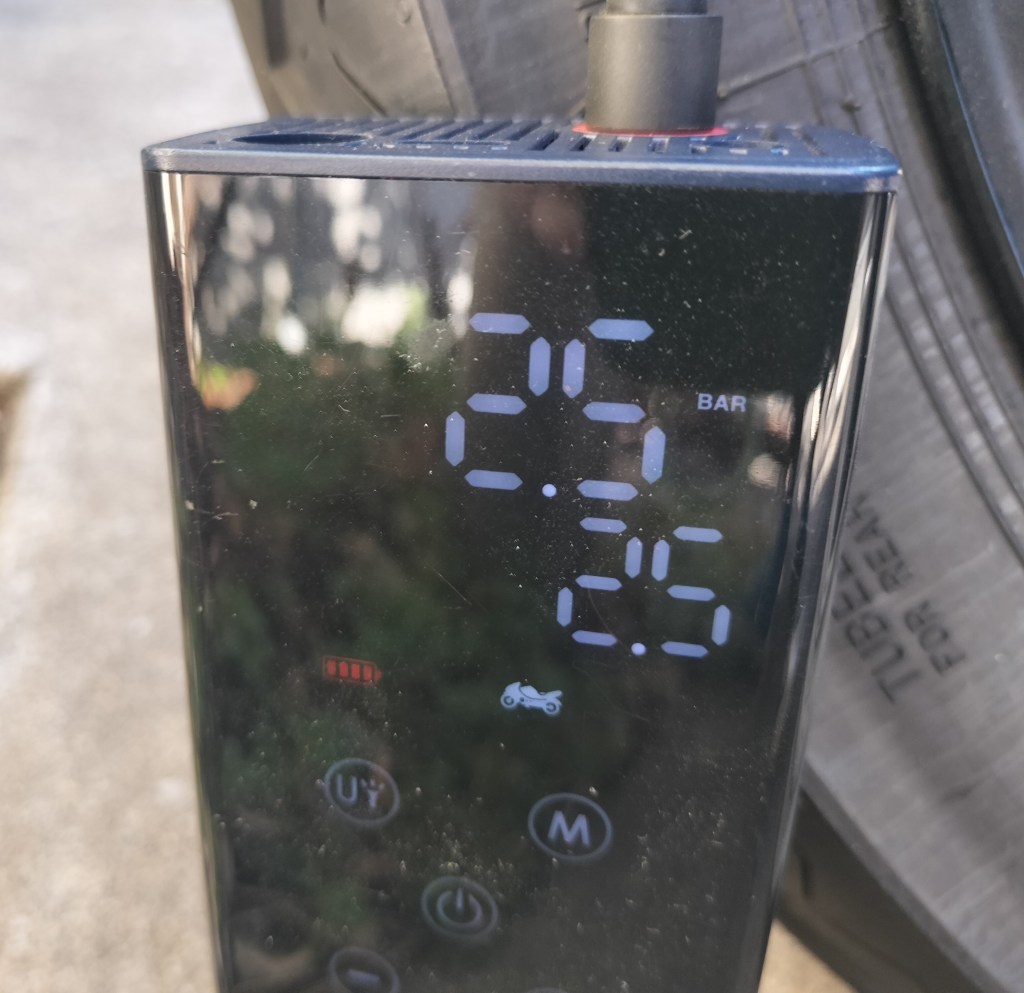 次にリヤです。規定値2.5Barに対し、2.2Barでした。こちらも10%前後、Airが抜けているようです。以前のPirelli Sportscompに比較すると、Airの抜けが若干多いかもしれません。規定値である2.5BarまでAirを充填しました。