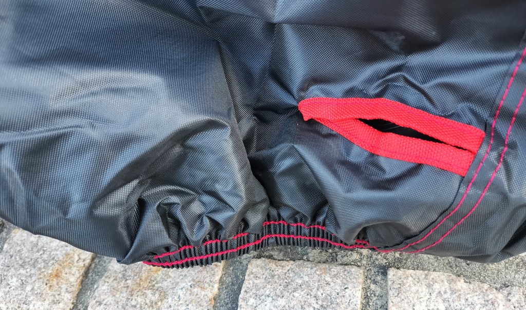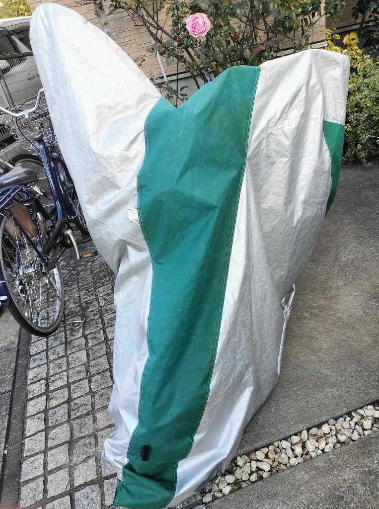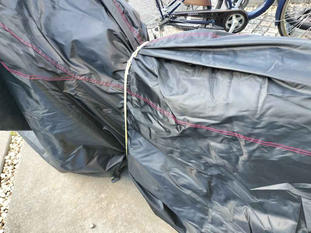 新しいカバーをかけてみました。生地はYAMALUBE製のものより少し重そうですが、その分しっかり感じがあります。特にマフラー周辺部分は補強されているようであり、他より少しずっしりした感じがあります。開口部の中央にはバックルがあり、風でカバーが飛んでしまわないようになっています。この部分の造りはYAMALUBE製よりもしっかりしていそうです。私はさらに自転車用の荷紐でカバーを固定しています。こうすると、台風でも大丈夫です。
