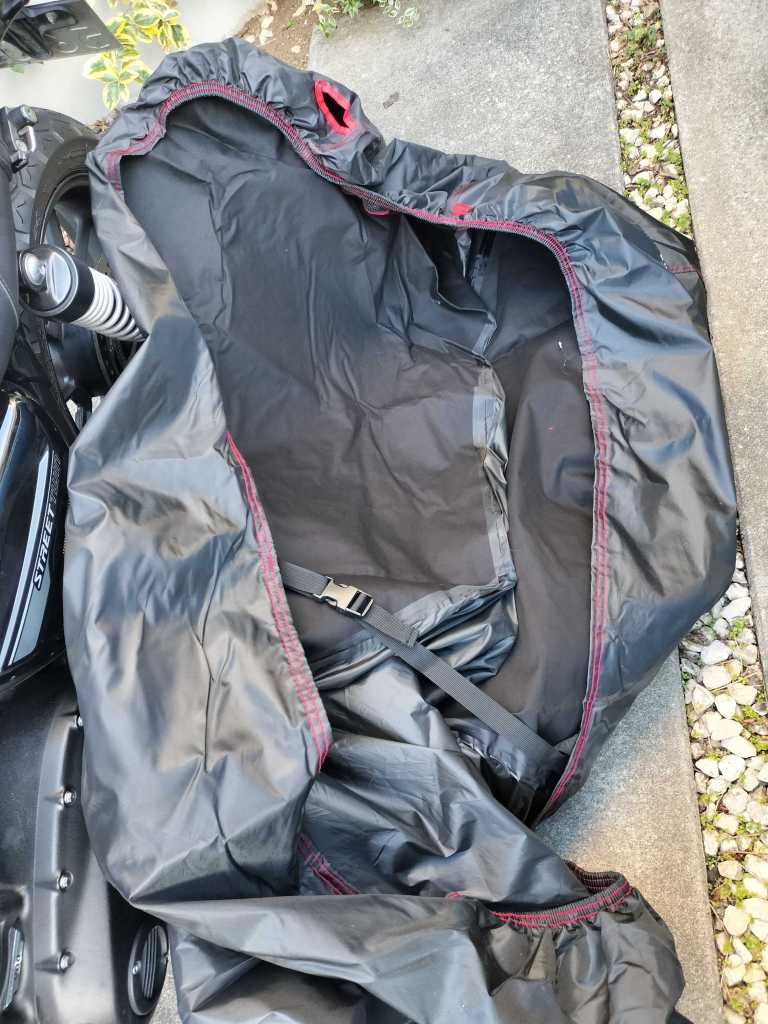 いざ、Street Twinにカバーをかけてみます。カバーの縁にはゴムが縫い付けてあるようです。中央にはバイクを固定するためのバックルがあります。YAMALUBE製ではそれらは紐であり、それを引っ張ってカバーを縛り付けるようになっていました。Kaedear製はゴムなので、慣れれば簡単に掛けられるようになると思います。ゴムはそこそこ強そうなので、風にも飛ばされないように耐えることができそうです。
