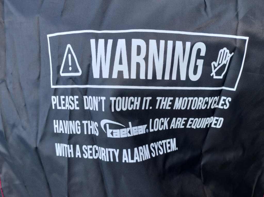カバーの前と後ろにはプリントがあり、「セキュリティー・アラーム・システム稼働中」といった趣旨のことが書いてあります。全体の印象ですが、とってもしっかりしたバイクカバーです。カバーをかけてから雪や雨が降りましたが、しっかりと撥水しています。これから1年間、大事に使いたいと思います。