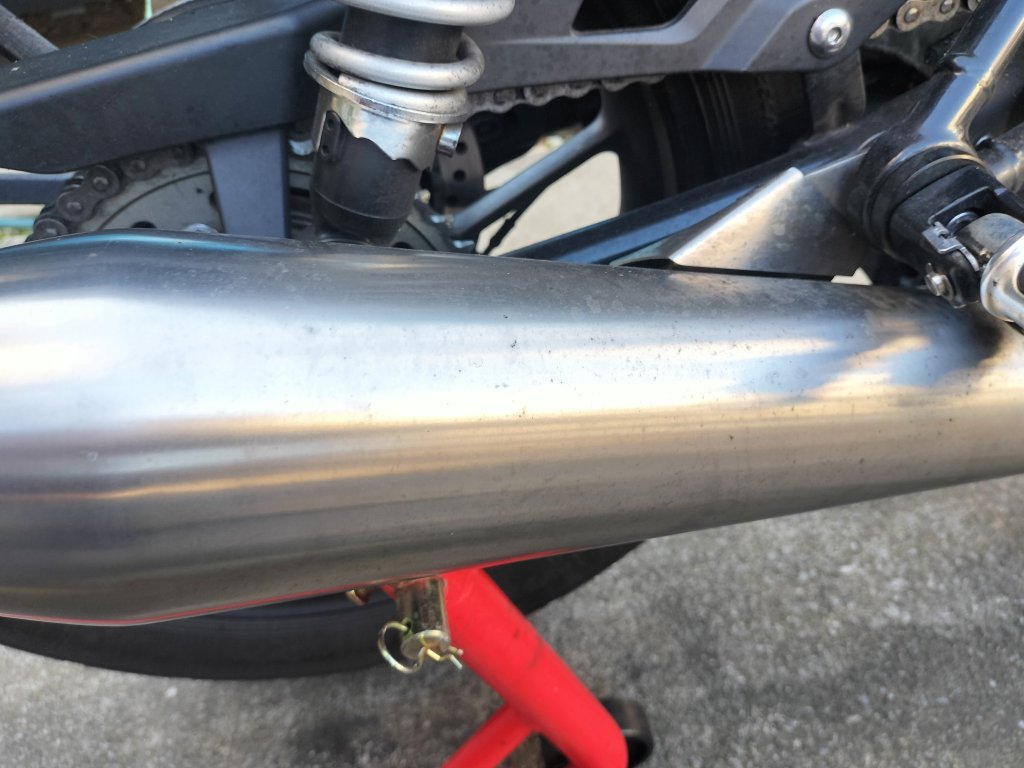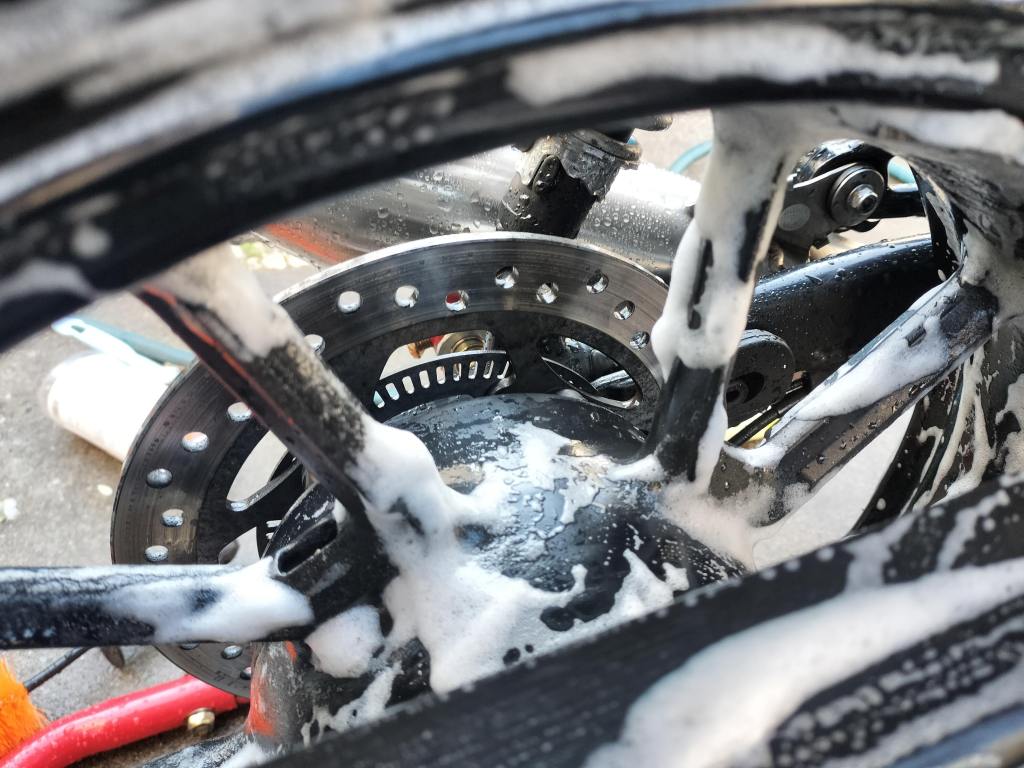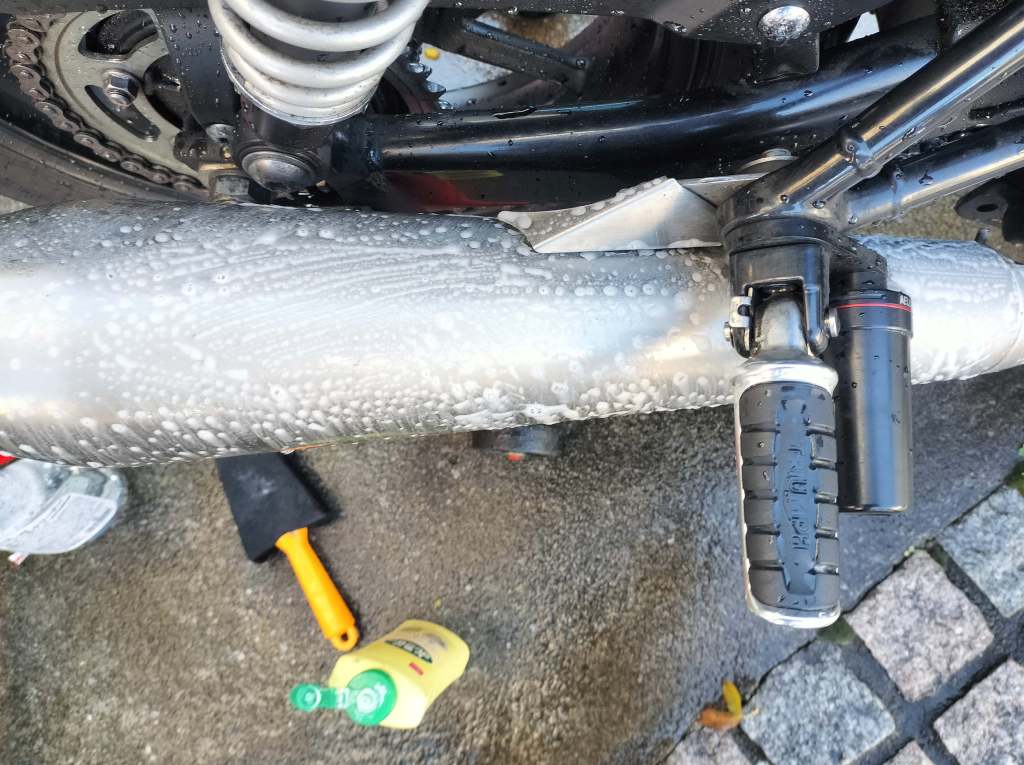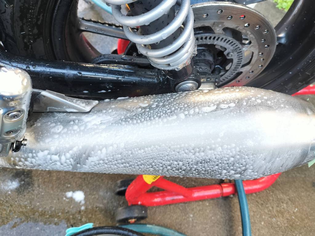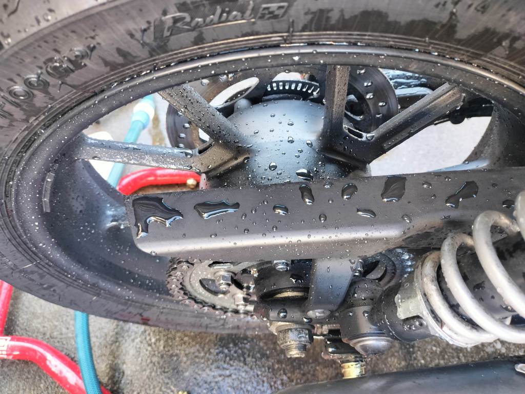 シャンプーしたら、水で洗い流し、タオルやブロワーで水滴を取り除きました。ボディー部分は、それほど汚れていなかったこともあり、きれいになりました。ホイールに使った新しいシャンプーは中性ですが、しっかり汚れが落ちたようです。マフラーもクリームクレンザーできれいになりました。リヤのチェーン周辺は、カークリームを布に付けて拭くことで、チェーンガードやフレームの油汚れがきれいになりました。
