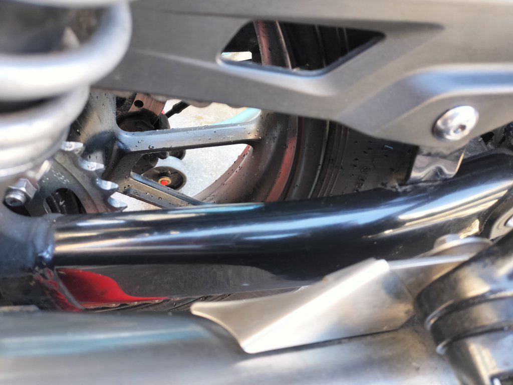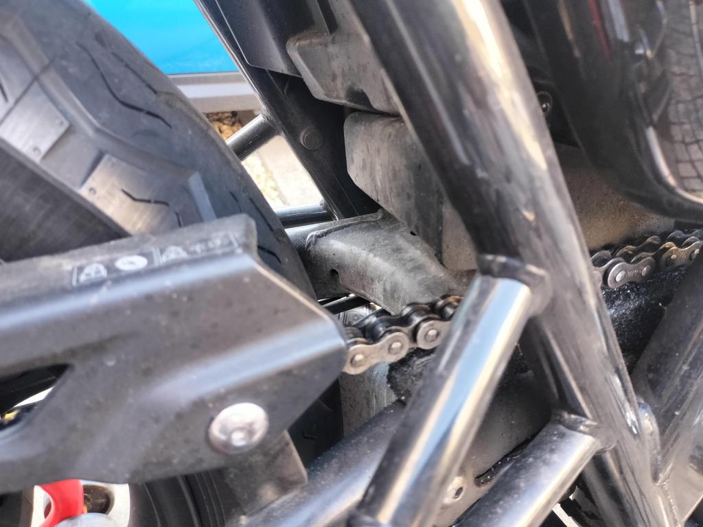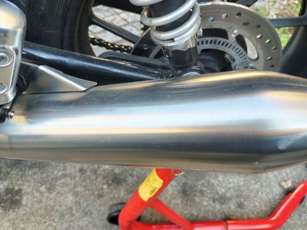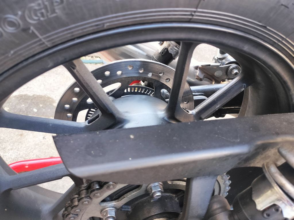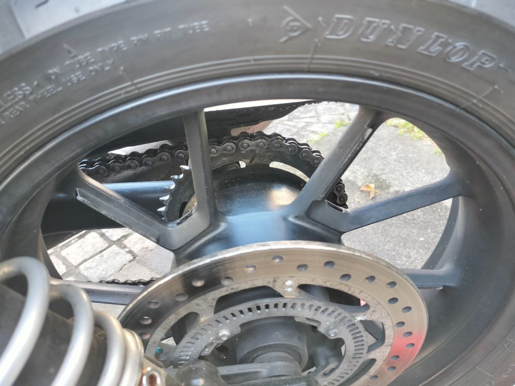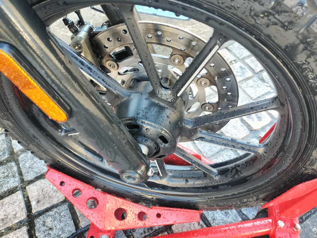 シャンプーしたら、水で洗い流し、タオルやブロワーで水滴を取り除きました。ボディー部分は、それほど汚れていなかったこともあり、きれいになりました。ホイールに使った新しいシャンプーは中性ですが、しっかり汚れが落ちたようです。マフラーもクリームクレンザーできれいになりました。リヤのチェーン周辺は、カークリームを布に付けて拭くことで、チェーンガードやフレームの油汚れがきれいになりました。