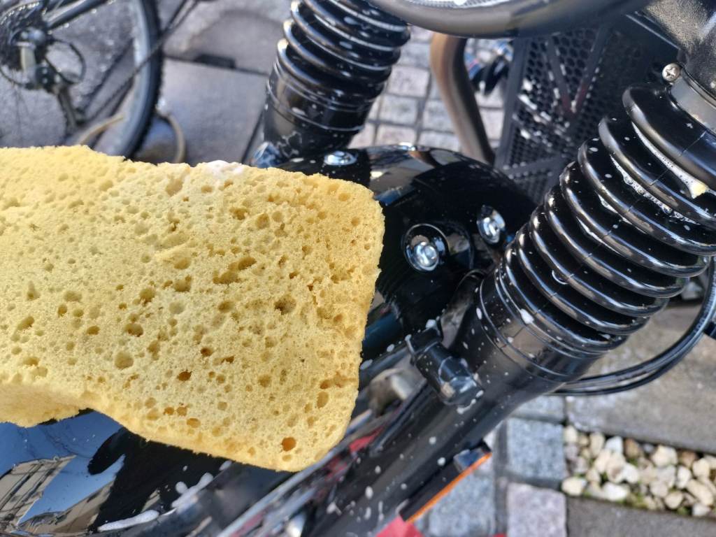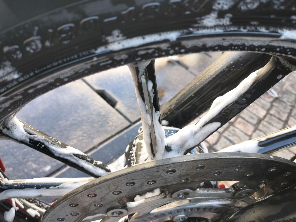 今回の洗車では、タンクやエンジンなどの部分を洗うためのシャンプーとしてKeeperが発売しているシャンプーを使いました。自動車用に販売されているオレンジ色のものです。原液を希釈して使うのですが、原液が少し少なかったのか、泡立ちが控えめだった感じです。ホイールには今回からホイール用のシャンプーを使い始めました。マフラー部分はクリームクレンザーです。