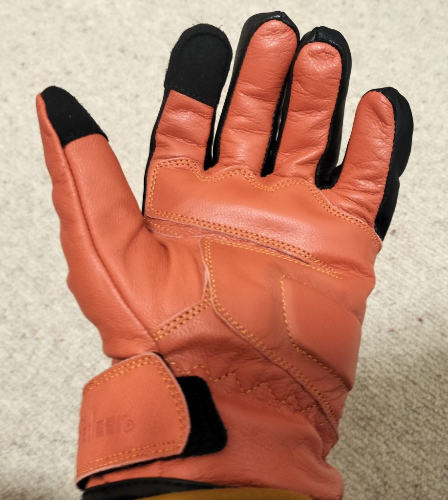 手首のところは加工してあります。これなら冷たい風が入りにくそうです。実際にはめてツーリングをしてみました。最初は革が硬いせいか、なかなか手が入りませんでしたが、1回使うと馴染んだのか、手が入りやすくなりました。革はとてもしっかりしています。冷たい風にも強い感じです。とはいえ、1時間くらい走っていると、それなりに冷たさが革を通して伝わってきます。でもこれまで使ってきたグローブと比較すると、寒さには強い方だと思います。これで6,000円ちょっとだったので、コスパを考えると充分と思います。