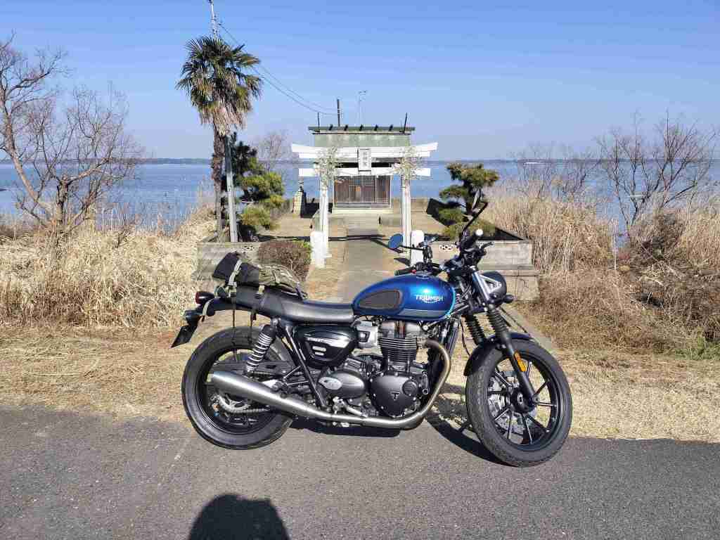 少し時間ができたので、「どこに行こうかな」と考えました。久しぶりに霞ヶ浦へ行きたくなったので、霞ヶ浦へ向かいました。まずは木原水神宮へ向かいました。Google Mapでチェックしていた場所のひとつです。駐車場はなさそうだったので、水神宮の前にStreet Twinを駐車しました。¥