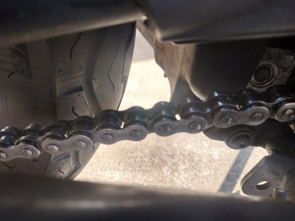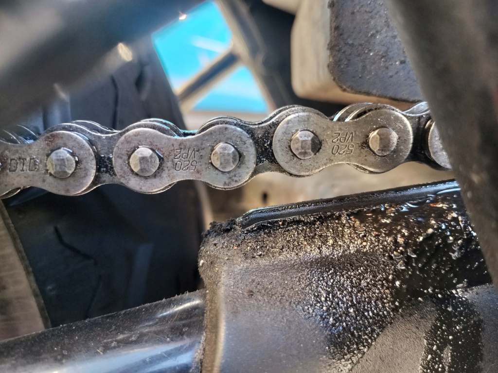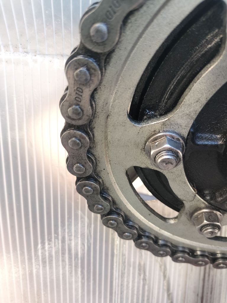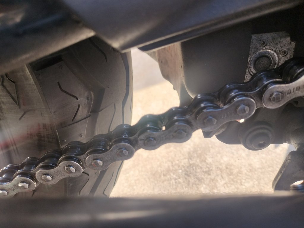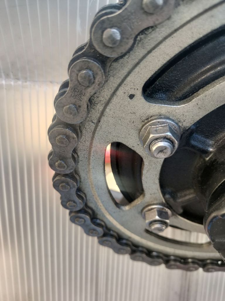 チェーンルブを吹付け、5分ほど待ってからウエスで余分なルブを拭き取りました。パッと見た感じ、チェーンに異常はなさそうです。