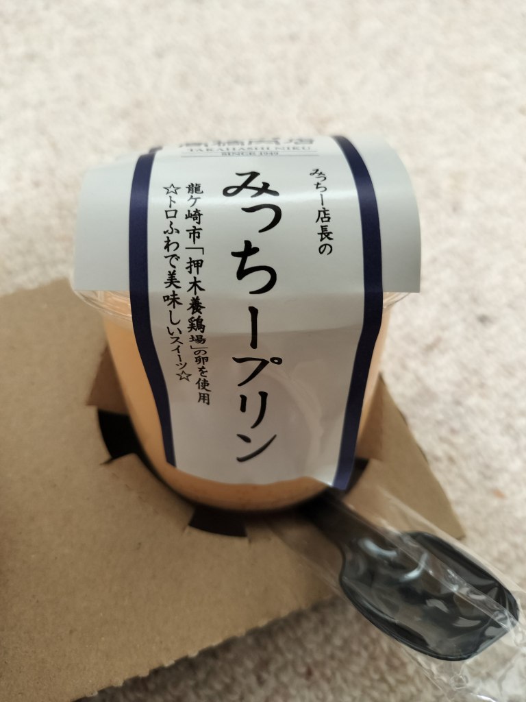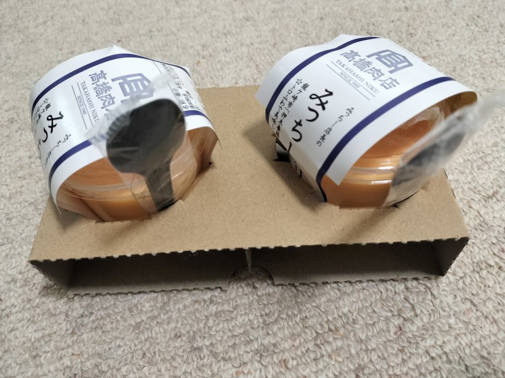 コロッケと一緒にプリンも買いました。私はバイク用のジャケットを着ていたので、段ボールで倒れないようにしてくれました。バイクに取り付けたバッグに倒れないように入れました。画像は自宅で撮影したものですが、大丈夫だったみたいです。