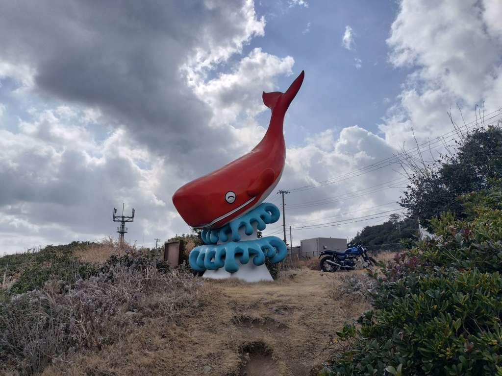 お昼ご飯を食べた後は、白亜紀地層を見に行きました。駐車場があるので、バイクを駐車して地層を見ることができます。駐車場の場所には「くじらの大ちゃん」があります。くじらの大ちゃんは海水浴場にあるくじらの形をしたすべり台のようです。人気があるらしく、ここにもくじらが備え付けられたようです。