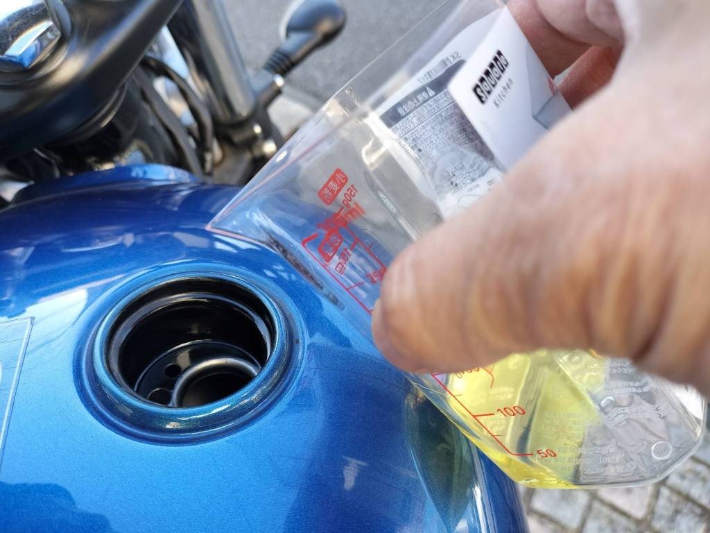 FCR-062があと30㎖ほど残っていたので、Street Twinに入れることにしました。Street Twinへ投入は3回目になります。計量してみると、30㎖には少し足りないでしょうか。でも使い切るのが目的なので、十分だと思います。
