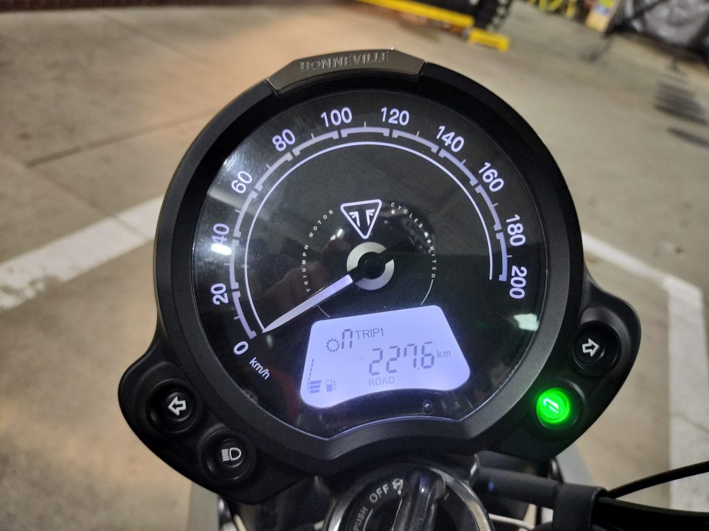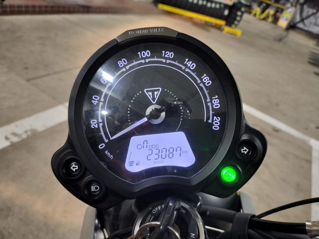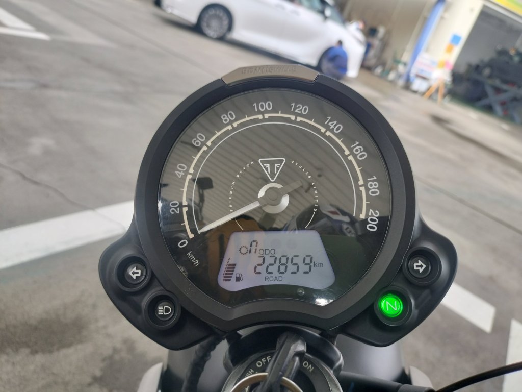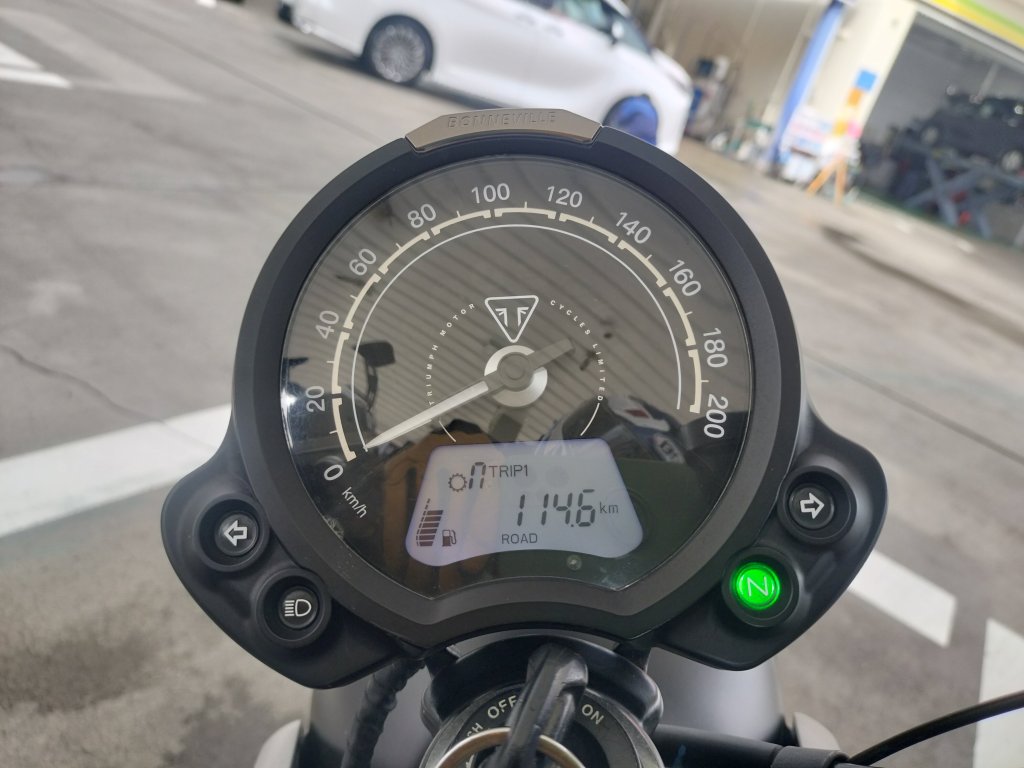 計量し、Street Twinのガソリンタンクに投入しました。投入したときは、満タンから100㎞ほど走ったときでした。