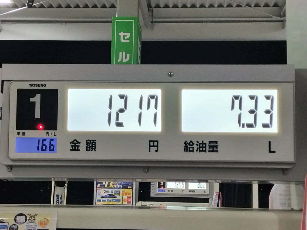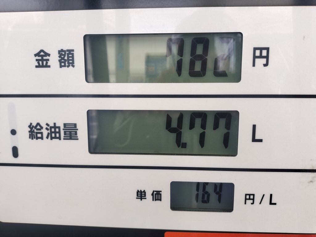 ツーリング前にガソリンを満タンにしました。114.6㎞走行して4.77ℓ給油給油しました。燃費は24.6㎞/ℓでした。一般道主体だったので、いつも通りだと思います。