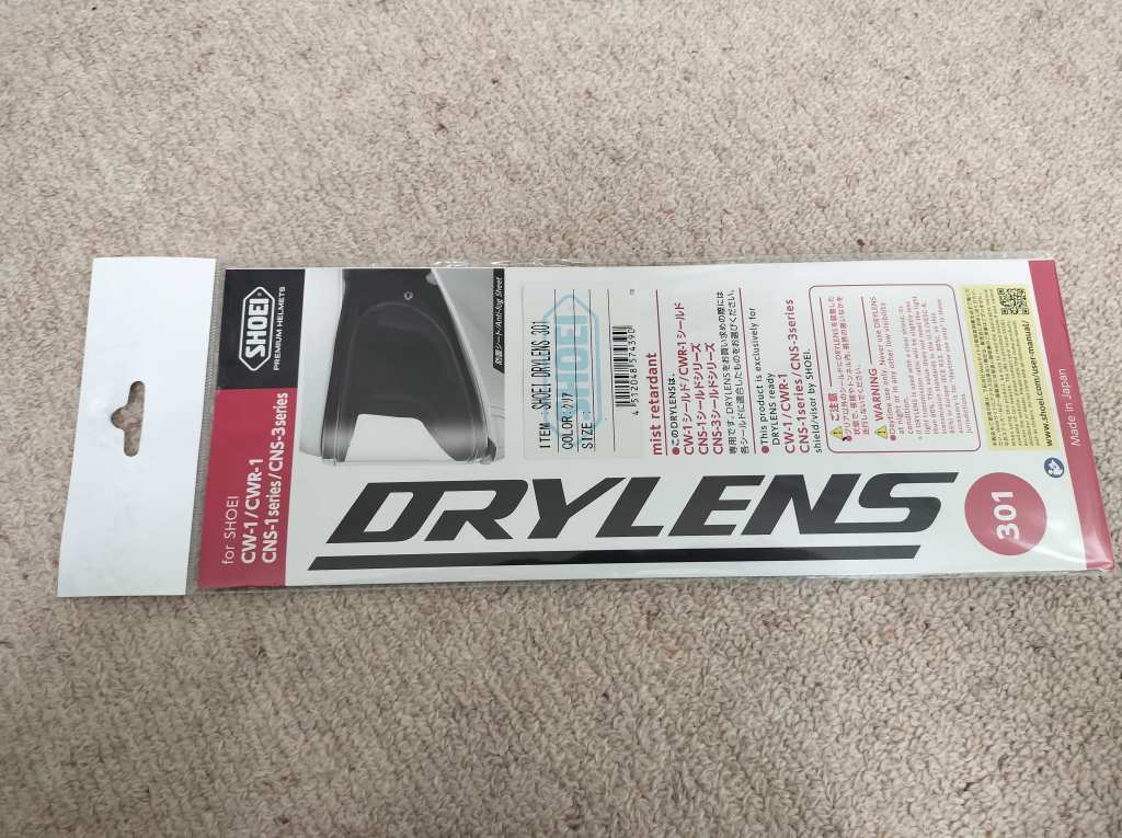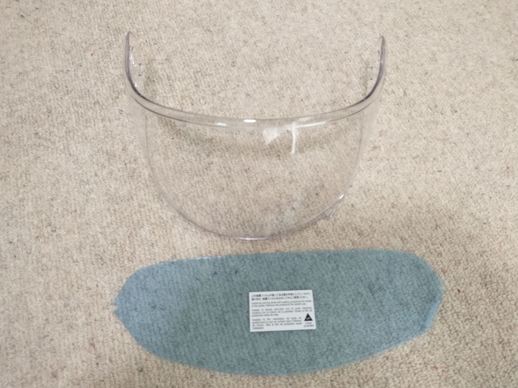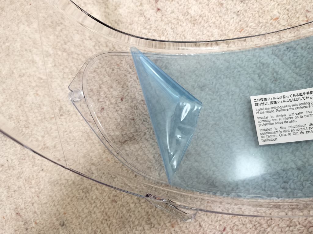 Drylensを開封し、シールドに取り付けます。手先が不器用なので、少し苦戦しましたが、なんとかDrylensを取付けました。最後にフィルムを剥がして完成です。