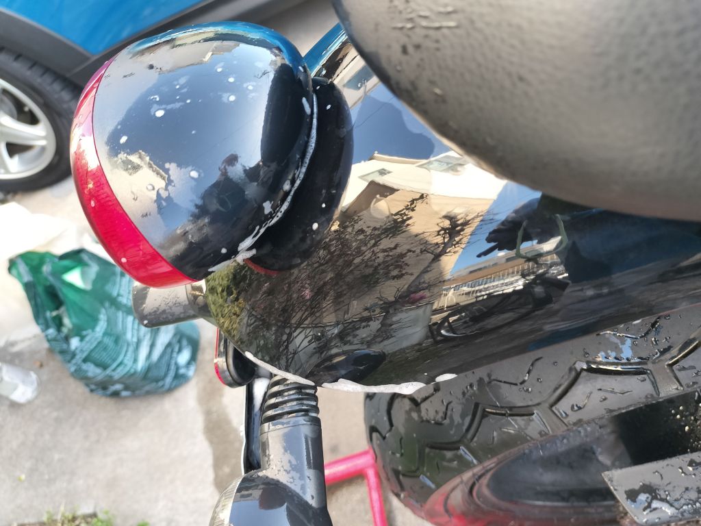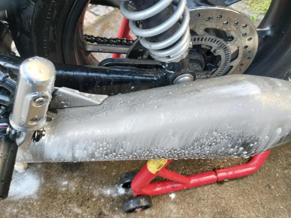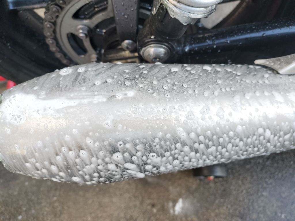 シャンプーで洗ったら、流水で洗剤を洗い流します。きれいに汚れを洗い流すことができました。油で汚れた場所は、カークリームで拭くときれいに蘇りました。水滴を拭き取ったり、ブロワーで吹き飛ばして除いて終了です。キレイになったので気持ちいいです。