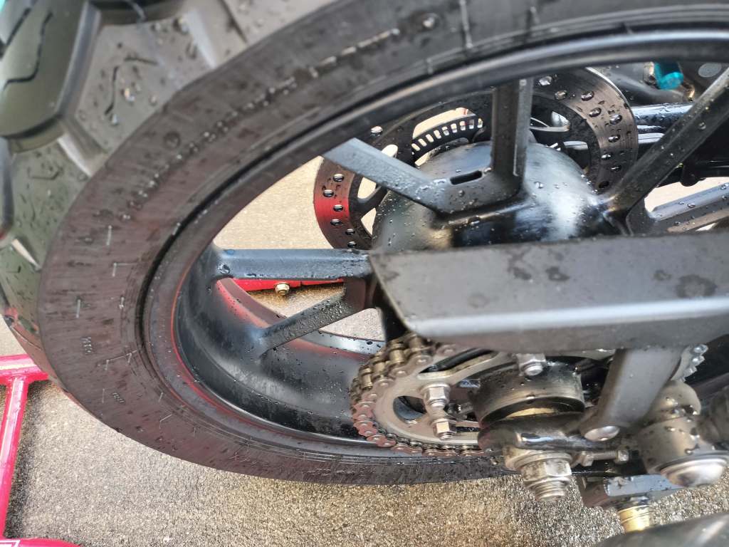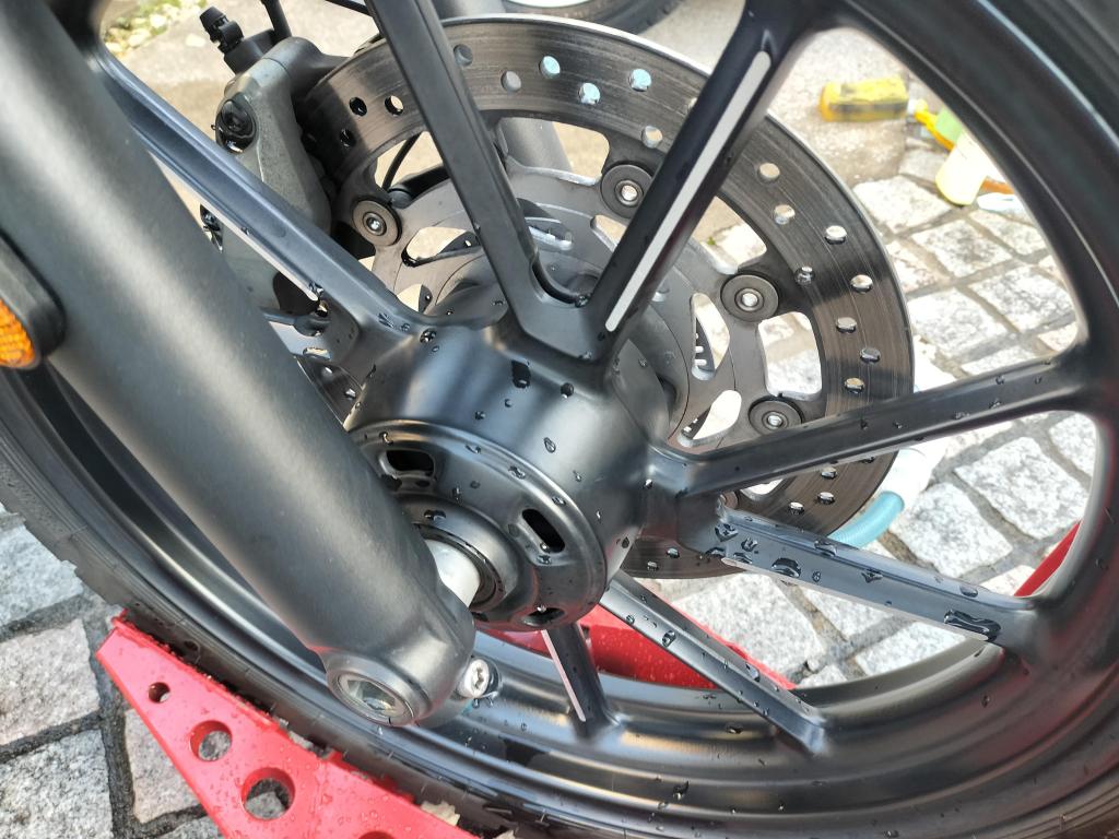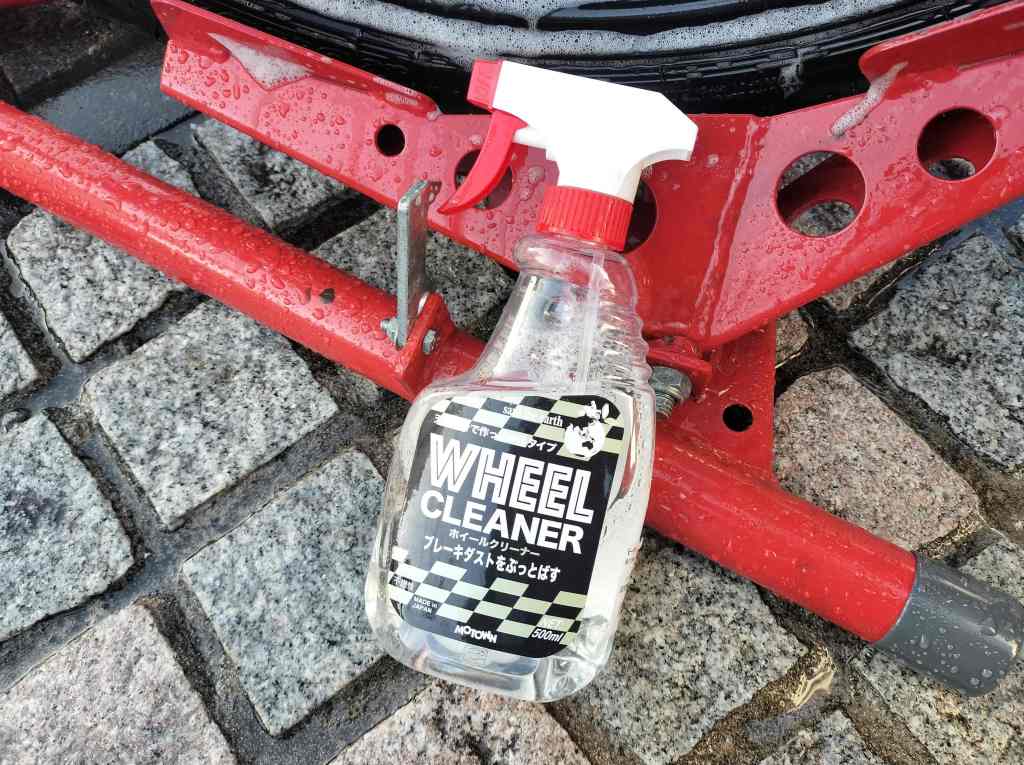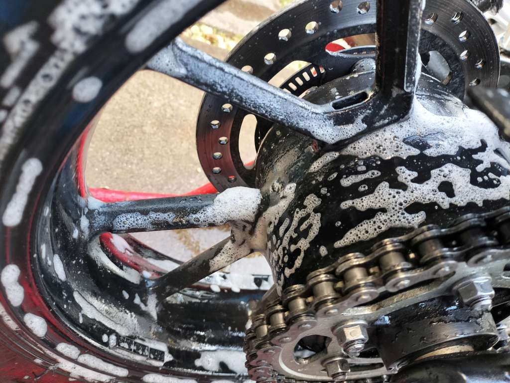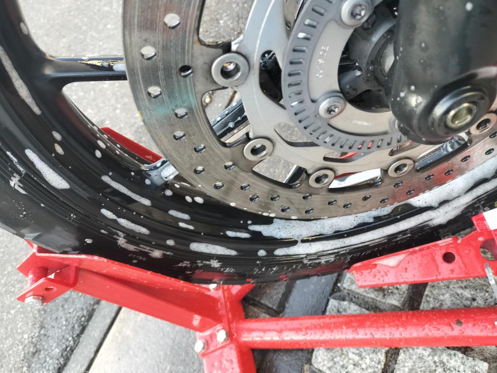 ホイール用シャンプーでホイールを洗います。中性ですが、あまり汚れていなかったせいか、よく汚れが落ちました。DIDのチェーンルブにしてから、あまりルブが飛び散っていないことも影響しているかもしれません。