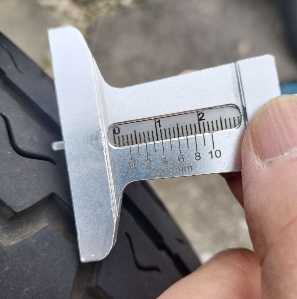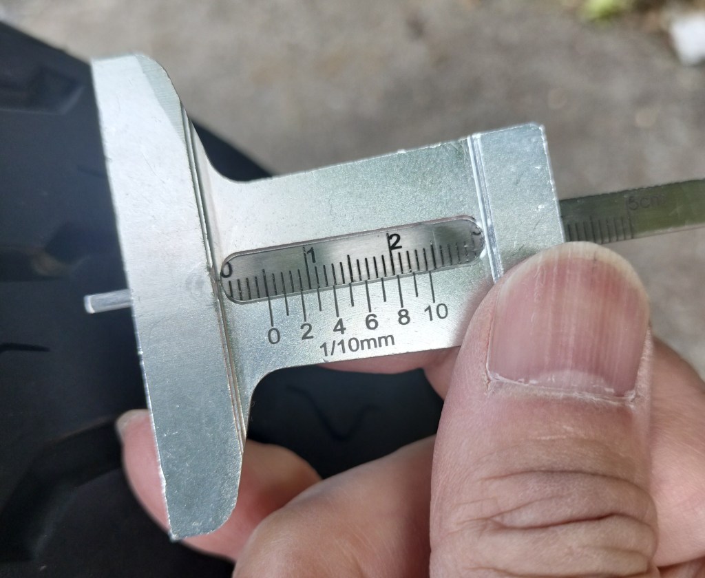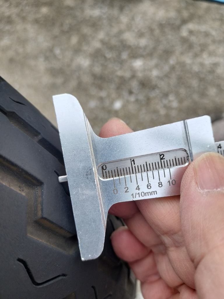 1,000㎞走った後に測った結果が上の画像です。それぞれ5.8㎜、5.8㎜、5.8㎜でした。1.0㎜程度減ったようです。思った以上に減っていました。このペースであればタイヤのライフは5,000㎞くらいかもしれません。でも、タイヤ表面だけ減りやすいコンパウンドだったのかも…とも思います。