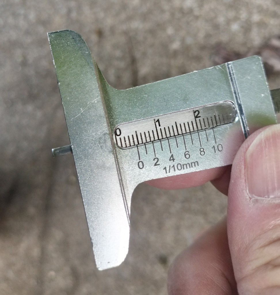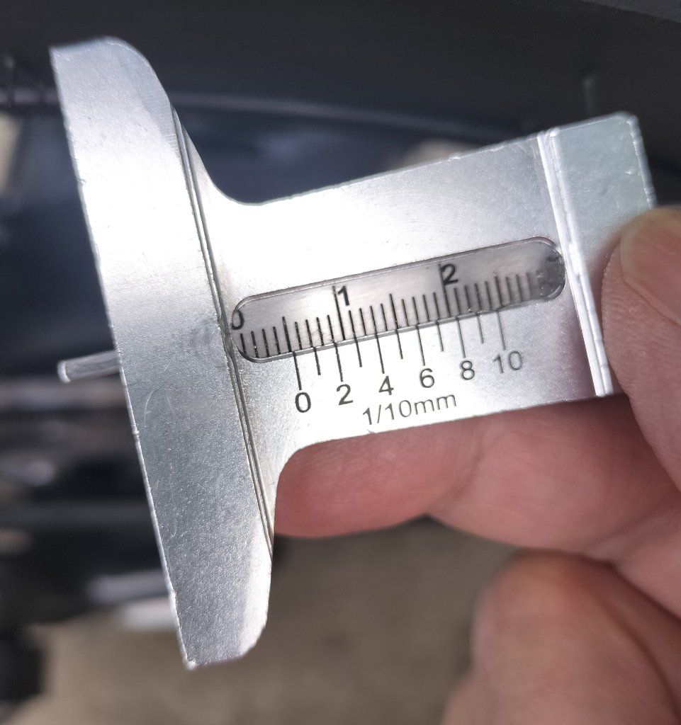 2,000㎞走った後に測った結果が上の画像です。それぞれ5.4㎜、4.9㎜、5.5㎜でした。やはり測定が下手であったせいか、測定値にバラつきがあり傾向は不明です。次の1,000㎞で測定するときに変化を観察したいと思います。